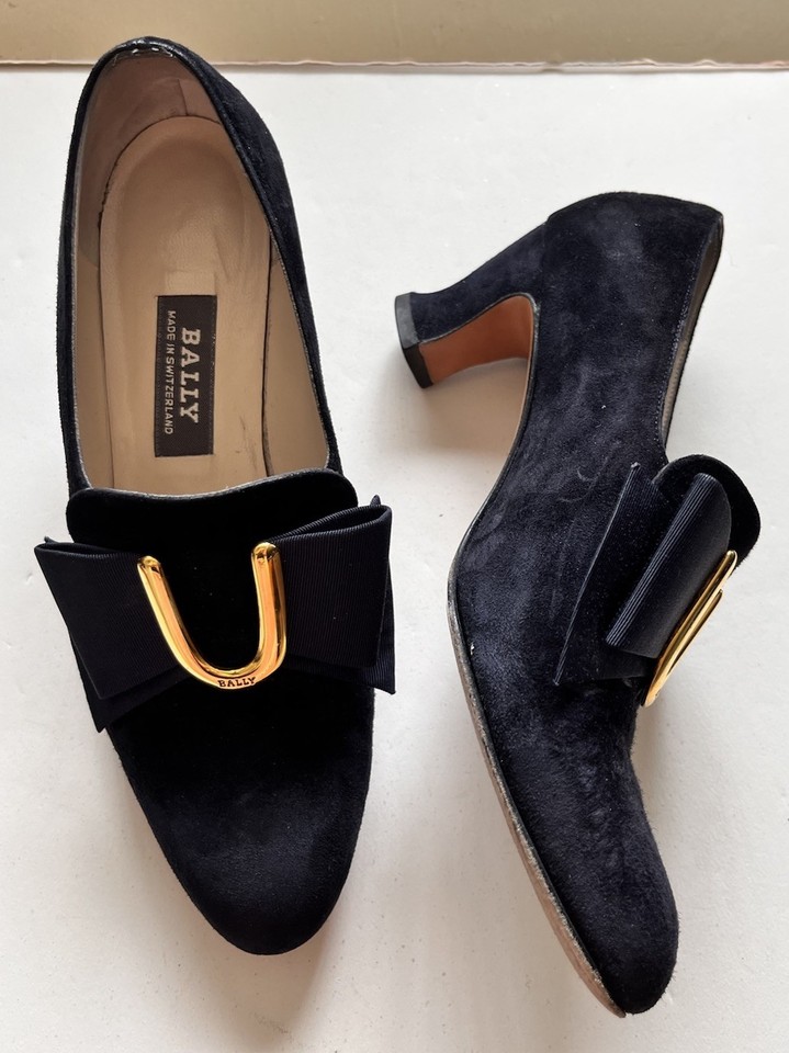 BALLY SWITZERLAND Witchy Poo Pilgrim Retro Vintage Navy Bow Pumps Heels 5 1/2