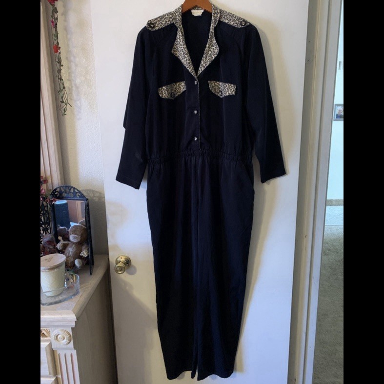 Vintage 80’s RIO Inc. Jumpsuit Romper Black with Cheetah Print Trim Accents Sz M
