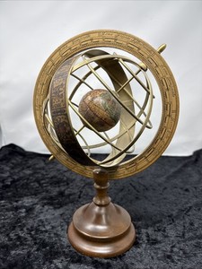 C858 Antique Brass Armillary Sphere Globe Astrolabe Zodiac Wooden Base