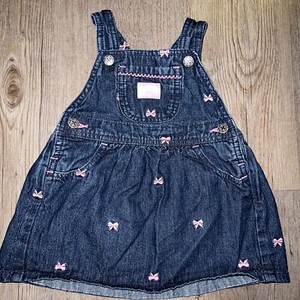 OshKosh B'Gosh Denim Dress Overalls Jumper Pink Embroidered Bows Size 24m Baby
