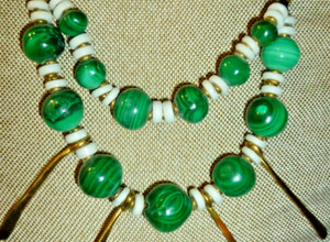 Vintage Malachite Gemstone Brass Necklace 18" Bead Fringe