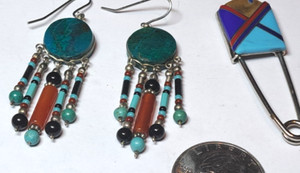 Earrings Silver Tone Filigree Southwest Faux Coral bead Dangle vintage Clip On