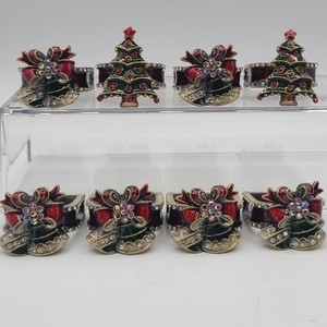 8 VTG Napkin Rings Christmas Trees Bells Rhinestone Metal Heavy