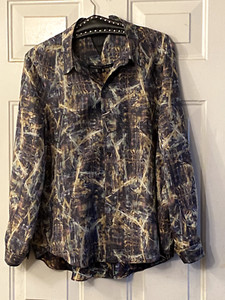 John Mark Sz PM Blouse Button Up Tunic White/Multi Graphic Paris Wire Collar
