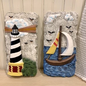 2 Slate Stone Plaques Cape Hatteras Lighthouse 3D Wall Hangings 10” Handpainted