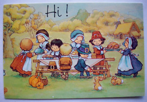 Pilgrim feast embossed vintage Thanksgiving Greeting card *PP4