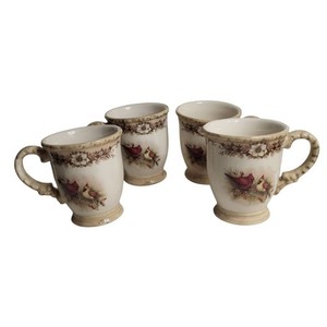 Set of 4 Cracker Barrel "Woodland" Pedestal Mugs Red Cardinals Winter Christmas