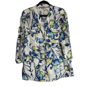 JM Collection Shirt Womens Plus 18 Button Up Blouse Top Floral Linen Blue Green