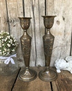 Antique ? 2x Candlesticks Copper Handmade Driven Oriental