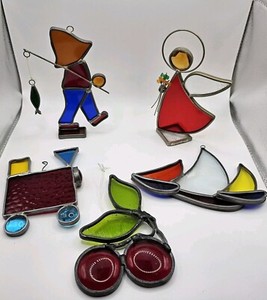 VTG Stained Glass Suncatcher Lot Glasglo Angel, Boy, Cherry, Sailboats & Train
