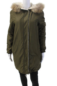 Maje Womens Raccoon Fur Trim Hooded Full Zipper Coat Olive Green Size 1
