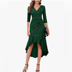 NEW Formal Cocktail Sequin Glitter Dress 3/4 Sleeve Midi Evening Gown L