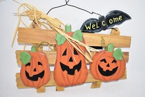 Halloween Jack O Lanterns Carved Pumpkin With Bat Welcome Door Sign w/Tags