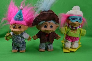 3 Vintage Troll Dolls,Birthday,Born To Ski,Western Cowboy,Blue & Pink Hair,Russ