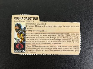 1984 GI JOE - FIREFLY COBRA SABOTEUR File Card Filecard With Topsider