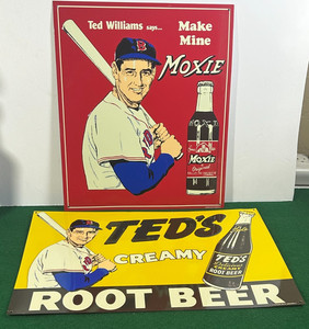 Lot of 2 - Ted Williams Tin Sign Moxie Original and Ted's Root Beer Circa 1990"s