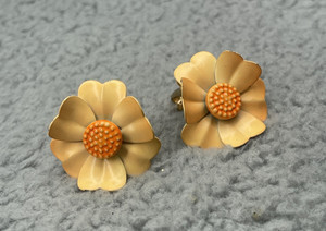 Vintage 1960s Mod Enamel Zinnia Earrings Orange Flower Clip Ons Well Made EUC