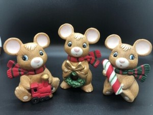 Homco Christmas Mice Figurines 5210 Train Wreath Candy Cane Scarves Set of 3