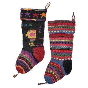 2 Icelandic Newari Handmade Wool Knit Christmas Stockings SET Mittens Colorful