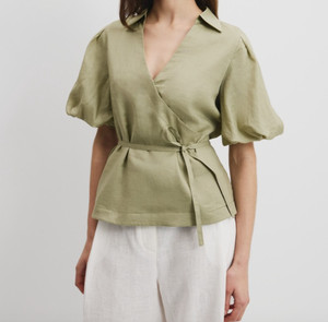 Country Road Womens Top Size 14 Green Artichoke Wrap Ramie Blouse Puff Sleeve