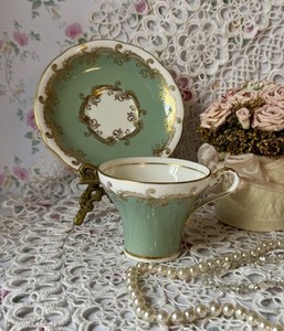 Aynsley Tea Cup and Saucer Set - Pastel Green Gold, Corset, English Bone china