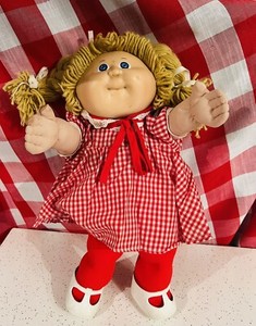 VTG Coleco Cabbage Patch Girl MOLD #3 Dark Blond Blue Eyes Dimple Red Dress