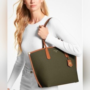 Michael Kors Emilia Large Tote Bag Olive Canvas Brown Leather Trim Gold Hardware