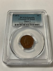 1873 Indian Head Penny 1C Open 3 PCGS Genuine VF Detail 53982137