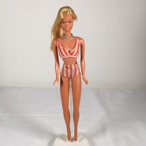 Vintage 70s Newport Barbie Doll in Orange Striped Swimsuit Beaded Necklace