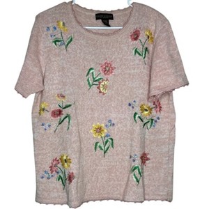 Salon Studio Floral Embroidered Knit Top Short Sleeve Coral Casual Size L VTG