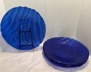 4 PC Vintage IVV Italian Art Deco Cobalt Blue Glass Dinner Plates Textured Wave