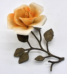 Vtg Delicate Porcelain Peach Rose Figurine On Brass Stem & Leaves Capodimonte