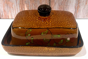 Ceramic Butter Plate Tray Dish w/Lid Hand Painted Floral & Sponge Paint Design