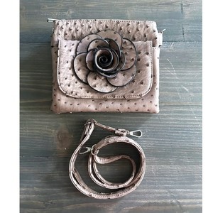 Ostrich Embossed Faux Leather Crossbody Taupe Flower Applique Adjustable Strap