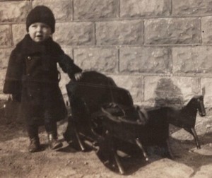 Child Standing Beside Toy Wagon Horse Carriage Style Knit Cap Coat 1920s