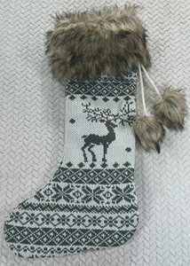 Fair Isle Faux Fur Knitted Christmas Stocking Reindeer Deer Pompom White Grey