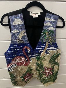 Retro FASHION FANTASY Sequined FLAMINGO Vest Size Large Tropical Party Glitz