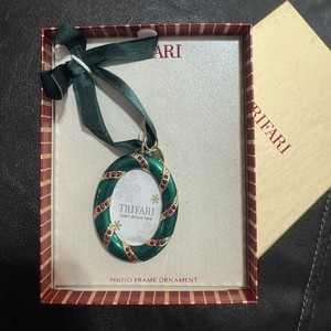 New Trifari 2007 Gold Tone Green Red Rhinestone Dangle Photo Frame Ornament