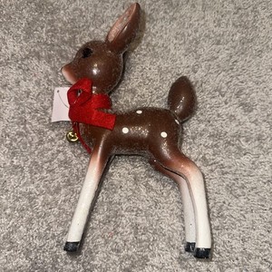 VTG Christmas fawn retro glitter ceramic standing 9.5” spotted deer red bow bell