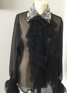 NWOT SHEER BLACK CHIFFON RUFFLE BLOUSE PEARL & BEADED COLLAR LONG SLEEVES