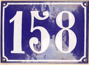 Large old blue French house number 158 door gate plate metal enamel sign - pick