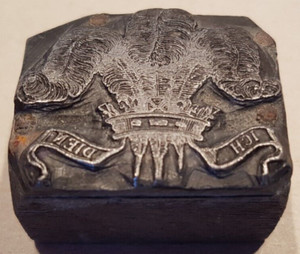 PRINCE OF WALES 3 FEATHER COPPER PLATE "ROYAL CREST" PRINTING BLOCK ON WOOD