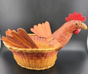 Vtg. Rooster Chicken Wicker Basket Hand Woven Centerpiece 8"×9.25"